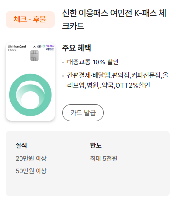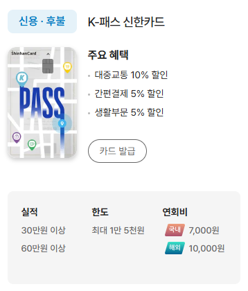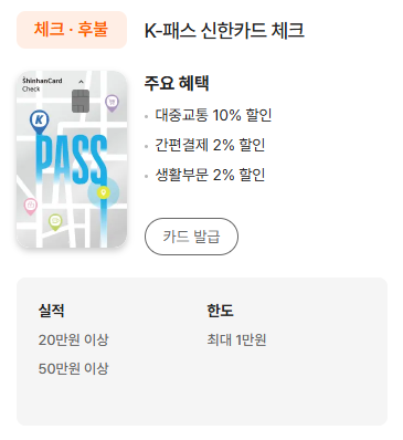 신한카드 K패스는 생활 밀착형 할인이 강점입니다.